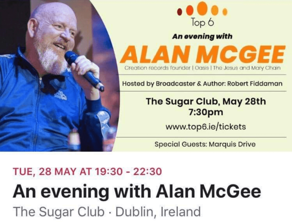 - 28th May – The Sugar Club Dublin (alongside an audience with Alan McGee)
