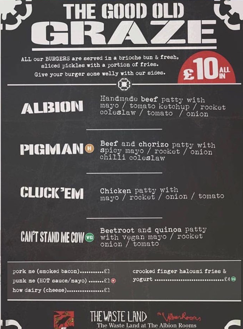 The Waste Land has the Bar, Outside seating area and kitchen selling bar food including its now infamous with locals, bar menu.