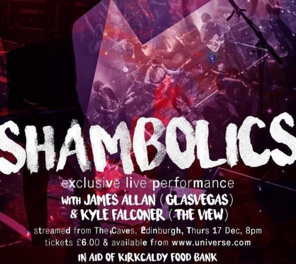 As the members of the band picked up their instruments to the final strains of the theme song to “Countdown”, it was obvious this was going to be an entertaining show. The YouTube broadcast went off without a hitch on Thursday night, pre-recorded in Edinburgh’s The Caves in aid of Kirkcaldy Food Bank. Fife’s “dreamy rock and roll” band, Shambolics, had just taken the stage and would later be joined by James Allen of Glasvegas and Kyle Falconer of The View for two stylistically different performances. It was an evening that would showcase Shambolics onstage versatility.