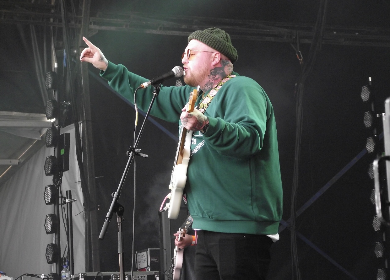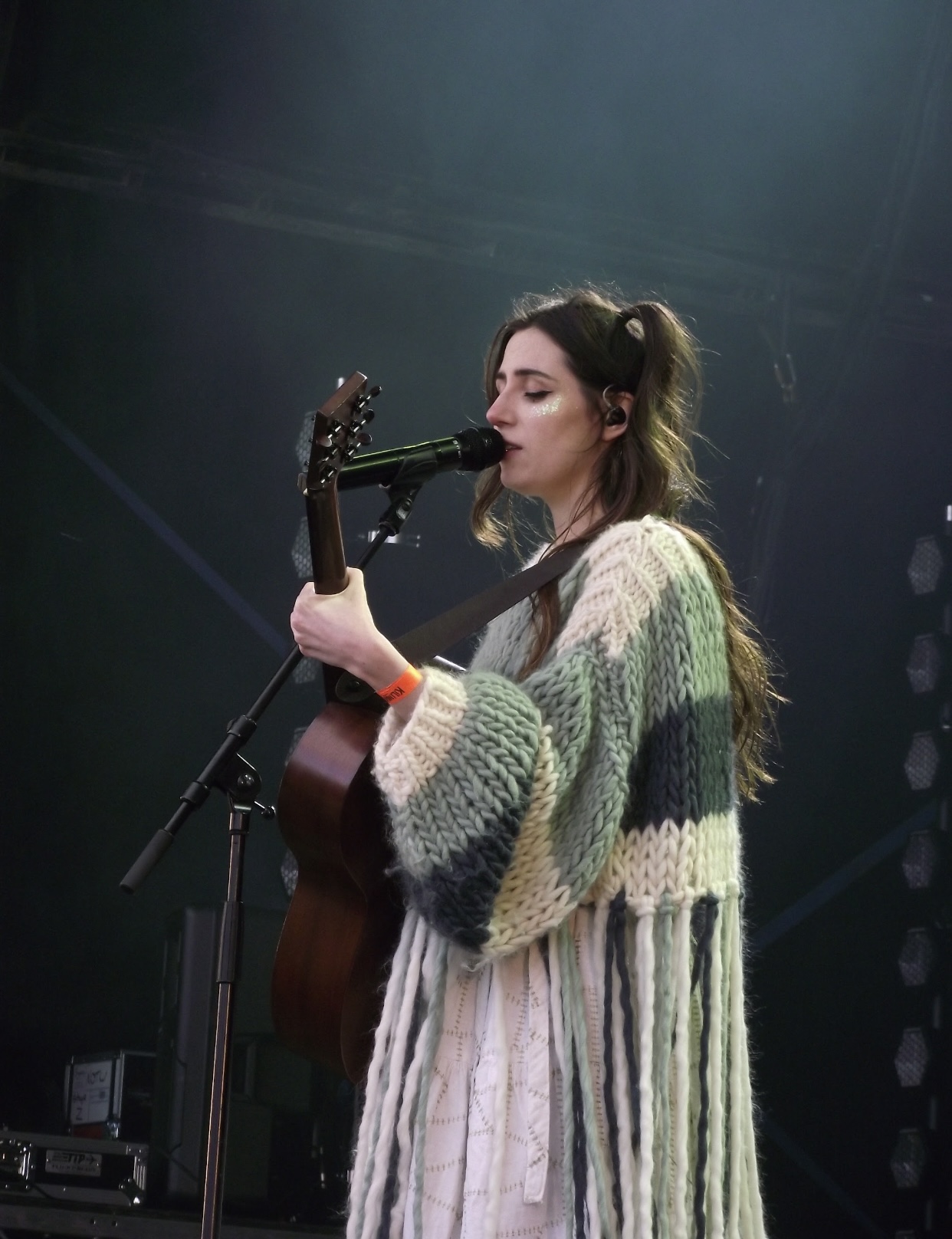Not long after, Deco played an energetic, vibey set in the Adrian Flux tent, which unfortunately all but drowned out Kitty Perrin who was performing on top of the Climate Bus parked nearby. That was a shame – she is a remarkable talent, playing what I’d describe as pop-inflected folk songs, which tell honest stories. Despite the challenges of the sound, Kitty was upbeat and engaging – one to catch live if you can.