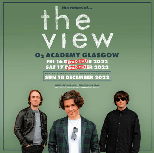 After The View announced their first show in more than five years at O2 Academy Glasgow on December 16th, phenomenal public demand saw all tickets snapped in a matter of minutes. A second night was immediately added on December 17th, which also rapidly sold-out. Responding to that huge interest, the band – Kyle Falconer (vocals/guitar), Kieran Webster (bass/vocals) and Pete Reilly (guitar) – now announce a third night on December 18th. Tickets for the show are now available from www.gigsinscotland.com and www.ticketmaster.co.uk.