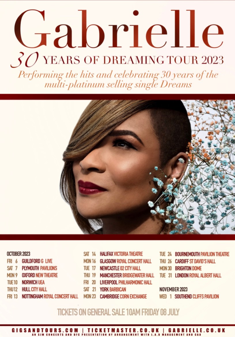 Tickets for the 30 Years of Dreaming Tour 2023 go on general sale from 10am next Friday, July 8th. They will be available from www.gigsandtours.com, www.ticketmaster.co.uk and www.gabrielle.co.uk. The dates are: