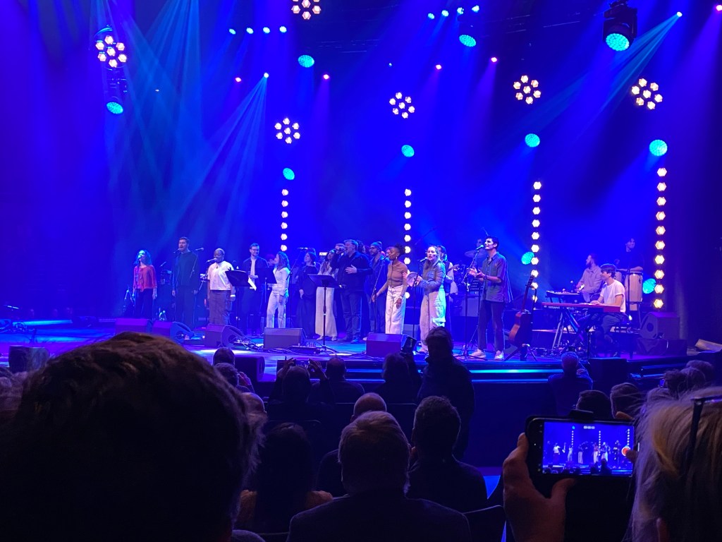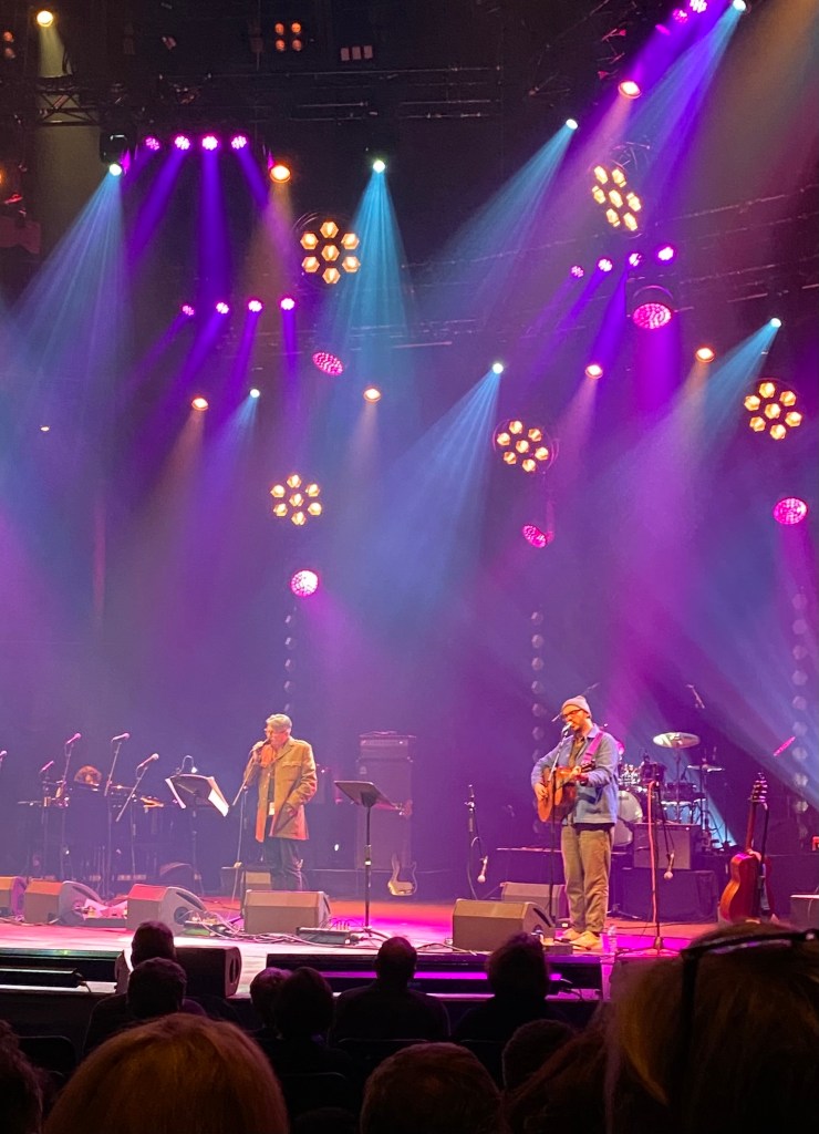 The first notes of the gig were played on an oboe and trumpet, while Guy stood in an iconic pose in the half light, shading his eyes to better see the audience with one hand, while the other was tucked in a jacket pocket. The atmosphere during the opening two songs as the performers, not led but guided and supported by Guy, shared frequent smiles with each other, was overwhelmingly wholesome and joyful. The musicianship and harmonies felt organic – perhaps not always smooth and flawless but entirely real, like a beautiful friendship, with its natural ups and downs, expressed through group singing. Or as Guy said a little later, “a warm ramshackle family affair.”