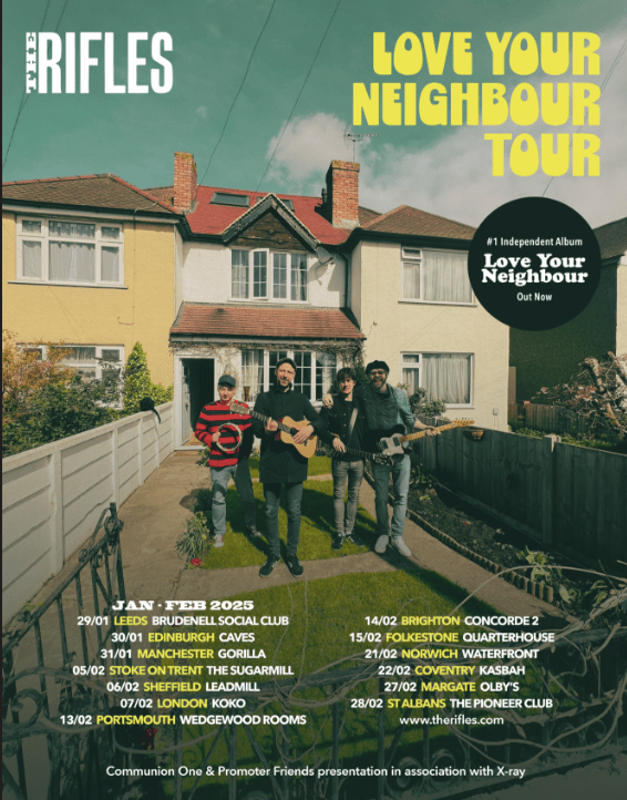 Riding high following the love that greeted their recent album ‘Love Your Neighbour’, The Rifles now announce details of a major UK headline tour that will commence in January 2025. Bringing the album’s sunbeam of optimism to the darkest spell of the year, this will be the first full tour that The Rifles have played since ‘Love Your Neighbour’ was released in July. And look at the chart positions that the album achieved: #1 on Independent Albums, and #2 on Album Sales, Physical Albums and Vinyl Albums, and #9 on Album Downloads.