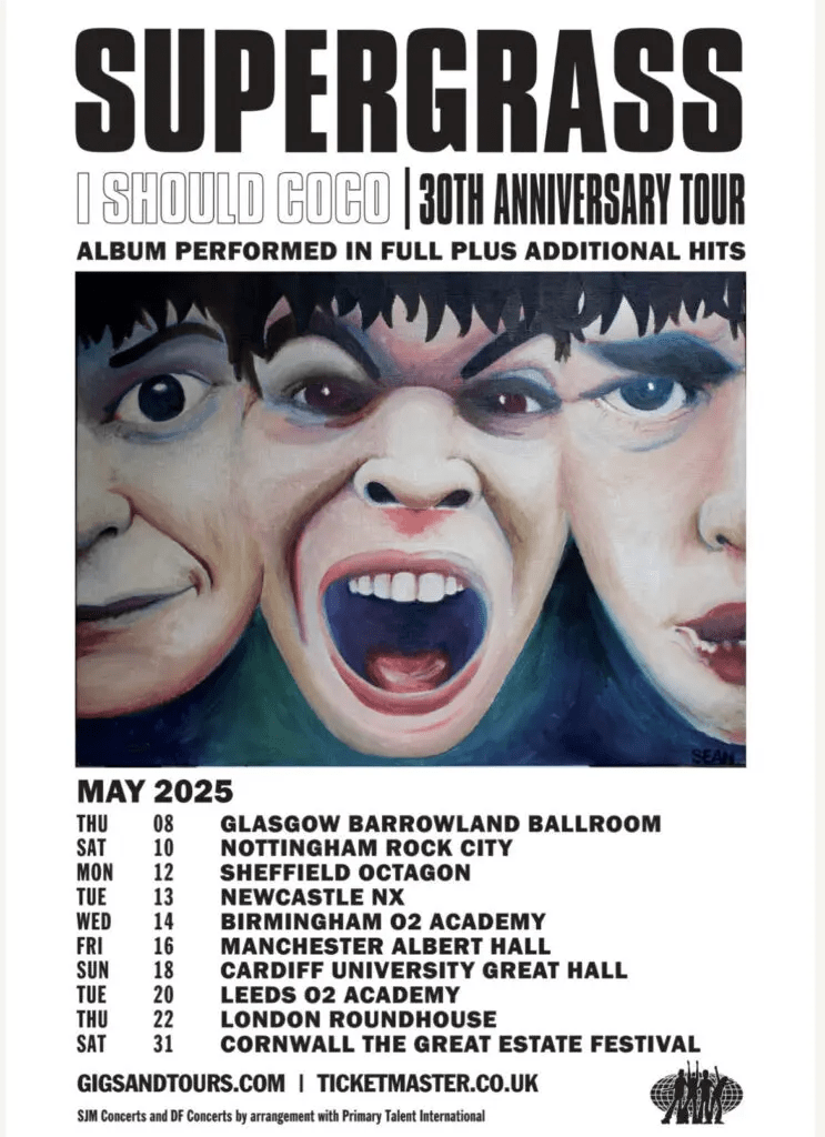 May 2025 will see Supergrass will perform in venues across Glasgow, Nottingham, Sheffield, Newcastle, Birmingham, Manchester, Cardiff, Leeds and London, before they head to the south-west for an appearance at The Great Escape Festival in Cornwall.
