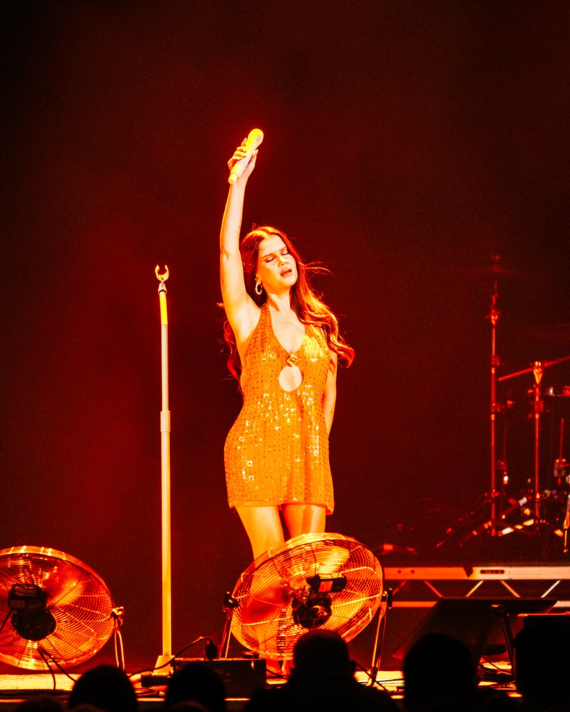 When Maren finally took the stage at roughly 8:50 pm, the audience’s screams filled the entire O2 Academy. As the house lights dimmed, a warm amber glow stretched across the stage, cutting through a swirl of smoke to set the scene. The first chords of ‘Cry in the Car’ sounded out, and Maren appeared in a stunning sparkling skirt, guitar in hand, her silhouette surrounded in gold light. Her voice cut cleanly through the mix, confident, rich, and effortless as the audience sang back every lyric. It was a commanding yet grounded entrance, perfectly in tune with her down-to-earth charm.