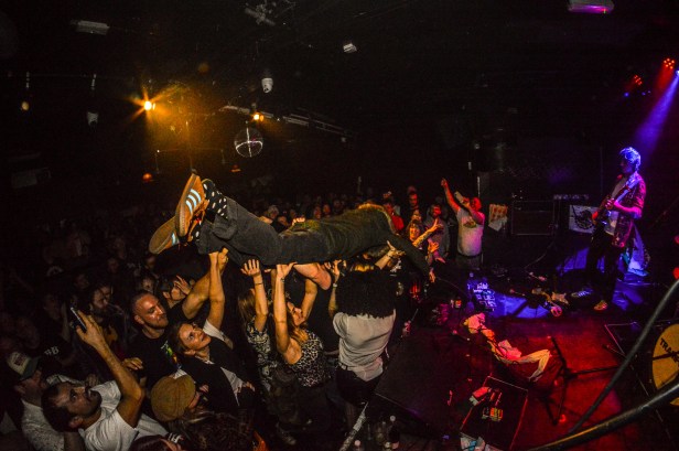 As they reached the final chorus, he slammed his guitar to the ground with a rattling thud that was felt around the room, wheeled the mic stand around before discarding it in a similar fashion, and threw himself on top of the crowd. For 10 very long seconds, the crowd steered him in every direction. He threw himself back on stage and smashed a cymbal in one final rebellious act.