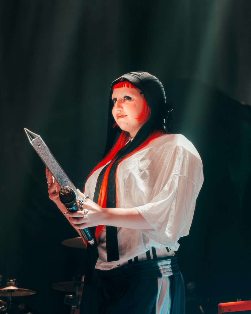 Next up was one of her most well-known tunes, “Working Bitch,” in which the dancers displayed a large white frame, providing a dramatic visual that quickly drew the audience’s attention. Ashnikko performed in the middle like a puppet on strings, demonstrating her distinct style and innovative artistry.