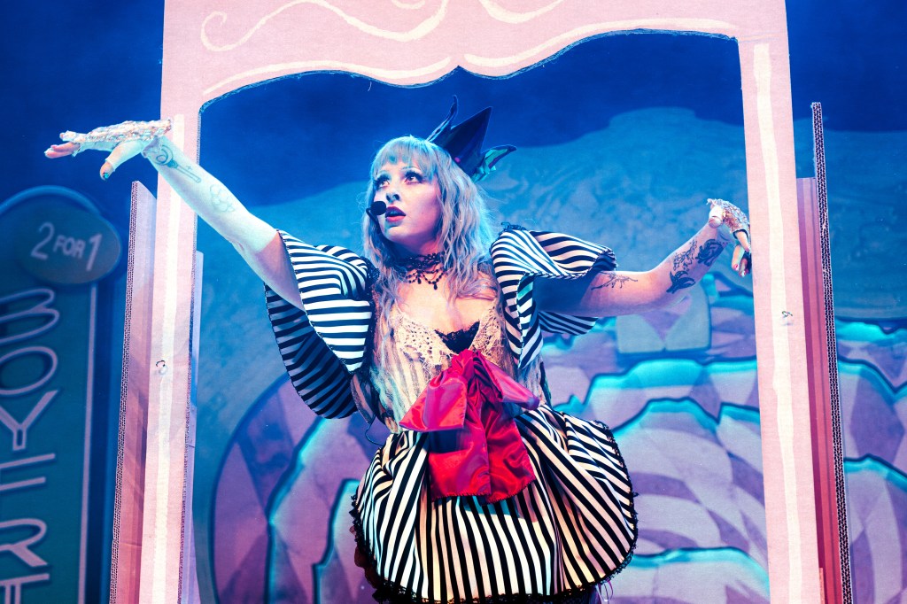 Then it was time for the moment everyone had been waiting for. As the clock struck 9:10 PM, the lights went out, and the intro started playing. Her 10-minute delay felt like part of the show, accompanied by a voice over the speakers mumbling about getting everything ready for a walk. While searching for her lip gloss, she discovered a tiny door at the bottom of her purse that led to Smoochie World, the stage. This introduction was one of the most impressive I had seen in a long time, with Ashnikko crawling through the tiny door as the lights flickered and a heavy guitar track played in the background, before launching into her first song, “Sticky Fingers.” Starting alone on stage, Ash quickly captured the audience’s attention. From the very first note, the crowd screamed every word back at her.