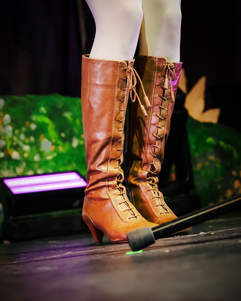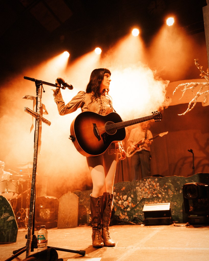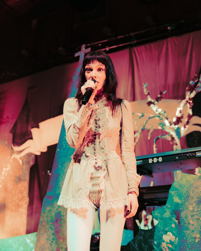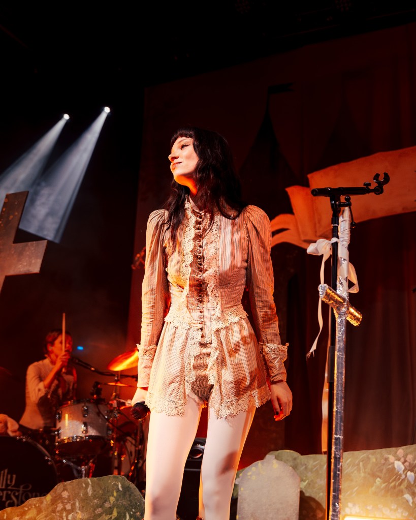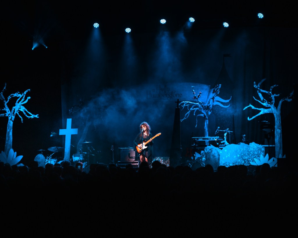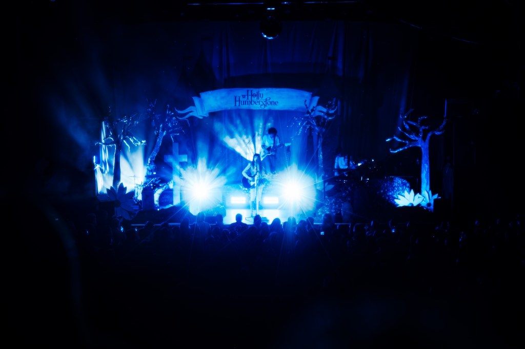 Then the clock hit 9pm; it was time for Holly to take the stage. The stage was jam-packed with lots of props from her “Die Happy” music video. The props included gravestones, trees, and foliage. I knew this was going to be a great night. Glasgow’s Old Fruitmarket is a stunning venue choice. Paired with all these props, it created an absolutely gorgeous stage setup.
