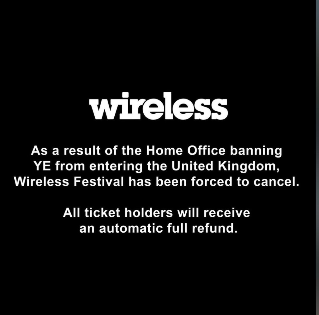 “As a result of the Home Office banning YE from entering the United Kingdom, Wireless Festival has been forced to cancel.